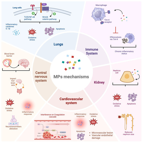 Some biological mechanisms triggered by MNPs in the cardiovascular system, the central nervous system, the immune system, the kidney, and the lungs, based on in vitro and in vivo studies. Arrows in immune system and kidney panels indicate MPs interaction with receptor or internalization. Created in https://BioRender.com.