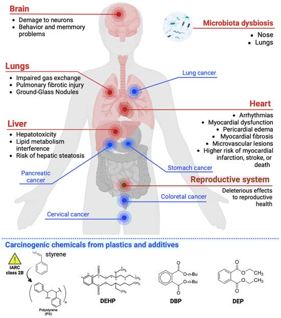 Plastic is a relatively recent invention in human history, and it has become ubiquitous in our everyday lives due to its versatility, durability, and low cost. However, these same characteristics that have made plastic so popular are the ones that now pose a colossal challenge to the planet’s health. Plastics are widespread in the environment at an alarming rate, and the proliferation of plastics is not only a problem of visual pollution but a profound threat to the health of ecosystems and living beings, with unpredictable consequences for the entire ecological system of our planet. MNPs can be found in every ecosystem, terrestrial, aquatic, and atmospheric, and they have already reached all human body organs through different routes. However, quantifying MNP particles by non-invasive methods in human tissues has not yet been available to determine the safe limits of exposure and accumulation in the body organs. Despite the increasing number of studies on MP effects in the reproductive, cardiovascular, and respiratory systems, comprehensive data regarding their toxicological effects are still limited and fragmented. This gap underscores the need for further investigation into the mechanisms of action, dose–response relationships, and long-term impacts of MPs on biological systems. Consequently, there are still few direct correlations between their presence and the development of diseases, with only suggestions and hypotheses of positive occurrence of certain physiopathological conditions such as inflammatory and oxidative status, besides some diseases such as cancer or intestinal, pulmonary, and cardiovascular affections, that seem to be induced or aggravated by these materials.