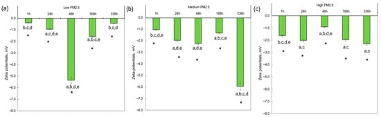 Zeta potentials of PM2.5 with MNP exposure. (a) PM2.5 at low mass concentration (2.5 µg/m3), (b) PM2.5 at medium mass concentration (10 µg/m3), and (c) PM2.5 at high mass concentration (25 µg/m3). The letters above the bars indicated the statistical difference (p ˂ 0.05): (a) Difference with MNP treatments for 1 h, (b) Difference with MNP treatments for 24 h, (c) Difference with MNP treatments for 48 h, (d) Difference with MNP treatments for 168 h, and (e) Difference with MNP treatments for 336 h. (*) Difference with their control at this stage.