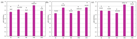 Aromaticity (AR) changes of PM2.5 with MNP exposure (ΔAR = AR/ARo, AR: MNP-treated PM2.5, ARo: PM2.5 (no MNP/control)). (a) PM2.5 at low mass concentration (2.5 µg/m3), (b) PM2.5 at medium mass concentration (10 µg/m3), and (c) PM2.5 at high mass concentration (25 µg/m3). The letters above the bars indicated the statistical difference (p ˂ 0.05): (a) difference with MNP treatments for 1 h, (b) difference with MNP treatments for 24 h, (c) difference with MNP treatments for 48 h, (d) difference with MNP treatments for 168 h, and (e) difference with MNP treatments for 336 h. (*) Difference with their control at this stage.