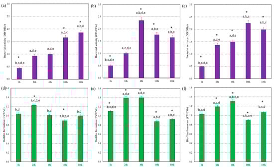 Bacterial activity of Gram-positive S. aureus in the presence of PM2.5 with and without MNP exposures by OD assay (OD: MNP-treated PM2.5, ODo: PM2.5 (no MNP/control)), (a) PM2.5 at low mass concentration (2.5 µg/m3), (b) PM2.5 at medium mass concentration (10 µg/m3), and (c) PM2.5 at high mass concentration (25 µg/m3). Biofilm formation of Gram-positive S. aureus in the presence of PM2.5 with and without MNP exposures by CV assay (CV: MNP-treated PM2.5, CVo: PM2.5 (no MNP/control)), (d) PM2.5 at low mass concentration (2.5 µg/m3), (e) PM2.5 at medium mass concentration (10 µg/m3), and (f) PM2.5 at high mass concentration (25 µg/m3). The letters above the bars indicated the statistical difference (p ˂ 0.05): (a) Difference with MNP treatments for 1 h, (b) Difference with MNP treatments for 24 h, (c) Difference with MNP treatments for 48 h, (d) Difference with MNP treatments for 168 h, and (e) Difference with MNP treatments for 336 h. (*) Difference with their control at this stage.
