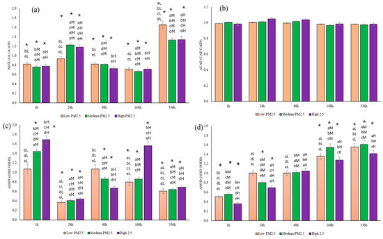 (a) Antioxidant activity ratio (ΔAOX = AOX/AOXo, AOX: MNP-treated PM2.5, AOXo: PM2.5 (no MNP/control)), (b) CAT ratio (ΔCAT = CAT/CATo, CAT: MNP-treated PM2.5, CATo: PM2.5 (no MNP/control)), (c) GSH ratio (ΔGSH = GSH/GSHo, GSH: MNP-treated PM2.5, GSHo: PM2.5 (no MNP/control)), and (d) SOD ratio, (ΔSOD = SOD/SODo, SOD: MNP-treated PM2.5, SODo: PM2.5 (no MNP/control)) of Gram-positive S. aureus in the presence of PM2.5 with and without MNP exposures. The letters above the bars indicated the statistical difference (p ˂ 0.05): (aL) Difference with MNP treatments for 1 h of low concentration PM2.5, (bL) Difference with MNP treatments for 24 h of low concentration PM2.5, (cL) Difference with MNP treatments for 48 h of low concentration PM2.5, (dL) Difference with MNP treatments for 168 h of low concentration PM2.5, and (eL) Difference with MNP treatments for 336 h of low concentration PM2.5. (aM) Difference with MNP treatments for 1 h of medium concentration PM2.5, (bM) Difference with MNP treatments for 24 h of medium concentration PM2.5, (cM) Difference with MNP treatments for 48 h of medium concentration PM2.5, (dM) Difference with MNP treatments for 168 h of medium concentration PM2.5, and (eM) Difference with MNP treatments for 336 h of medium concentration PM2.5. (aH) Difference with MNP treatments for 1 h of high concentration PM2.5, (bH) Difference with MNP treatments for 24 h of high concentration PM2.5, (cH) Difference with MNP treatments for 48 h of high concentration PM2.5, (dH) Difference with MNP treatments for 168 h of high concentration PM2.5, and (eH) Difference with MNP treatments for 336 h of high concentration PM2.5. (*) Difference with their control at this stage.