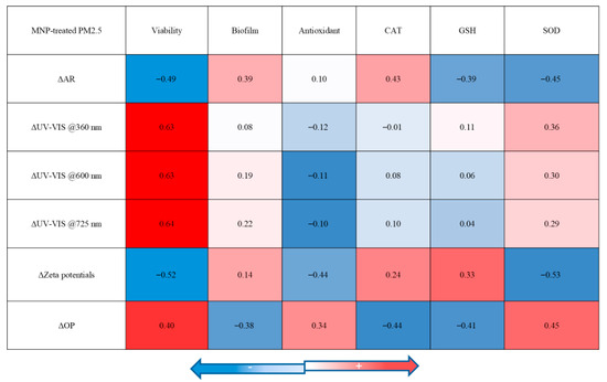 Figure 7 shows the overall interaction pathways between MNP-treated PM2.5 and bacteria. Of course, the overall calculation may cause errors, but to see the total relationship of the results, all the data were used, regardless of differences in PM2.5 concentration. Statistical analysis revealed the importance of MNP contamination of the PM2.5 environment due to the leaching/deformation impact of MNPs. For example, a negative correlation was found between viability and AR (r = −0.49), and zeta potential (r = −0.52). The light intensities and OP exhibited positive correlations with bacterial activity (r = 0.63–0.64, and 0.40, respectively). These results indicated that viability was primarily influenced by light intensities, zeta potential, and AR rather than OP. In addition to bacterial activity, biofilm formation is mostly controlled by AR and the OP when exposed to MNPs, rather than light intensities and zeta potentials of PM2.5. There is a moderate positive link between AR (r = 0.39) and biofilm formation, and a moderate negative link between OP and biofilm formation after MNP contamination, compared to the zeta potentials (r = 0.14) and light intensities (r = 0.08, 0.19, and 0.22 at 360, 600, and 725 nm) of PM2.5. Moreover, AR, zeta potentials, and the OP of PM2.5 affect the oxidative stress-related indicators of bacteria. For example, zeta potential and OP are moderately linked with the antioxidant activity of S. aureus in the presence of PM2.5 after MNP exposures. The CAT and GSH are dominated by AR and OP of MNP-treated PM2.5. The zeta potentials, AR, and OP of PM2.5 triggered the SOD of S. aureus.