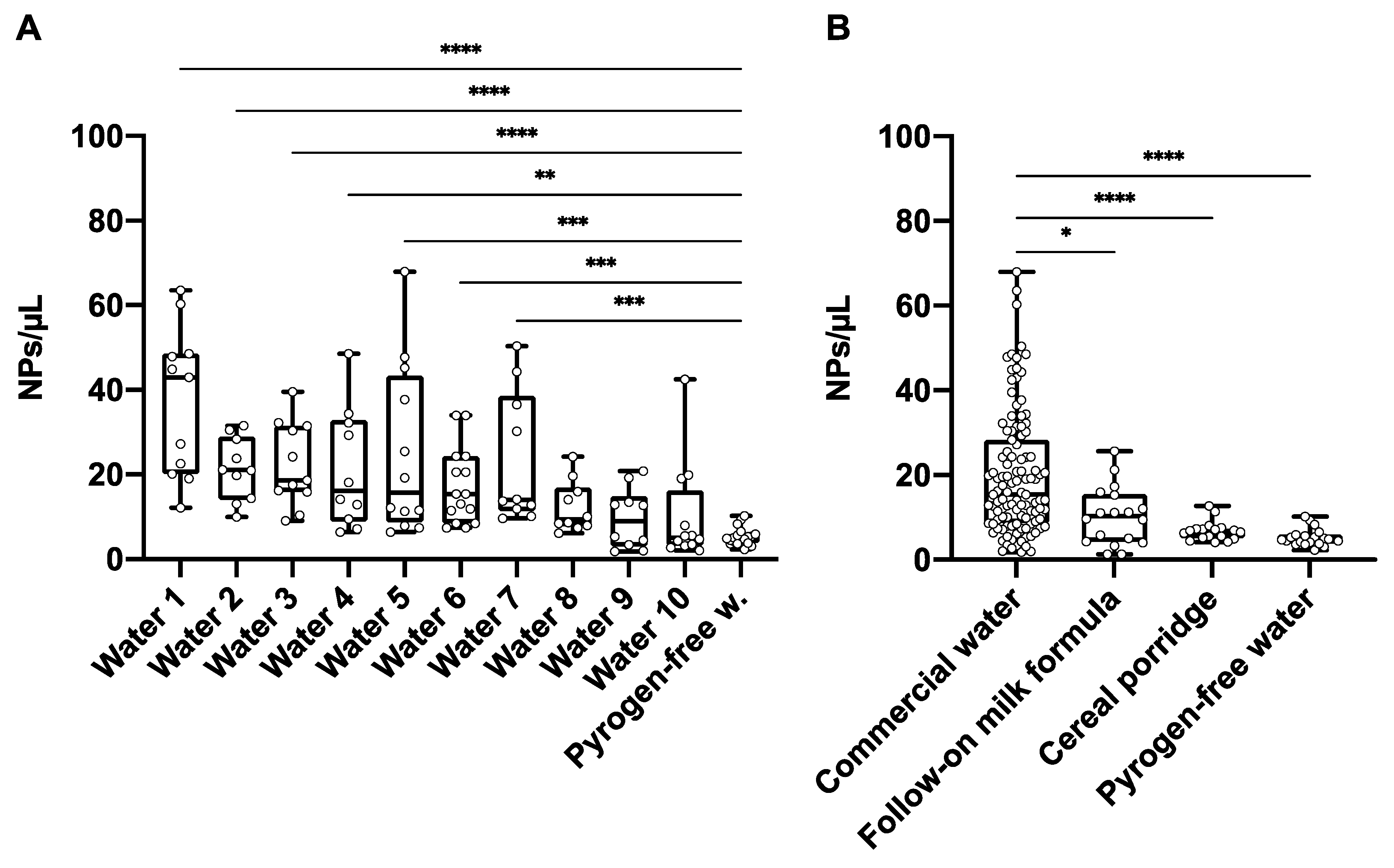 3.2. Nanoplastic Contamination in Infant Formula, Cereal Porridge and Carbonated Beverages