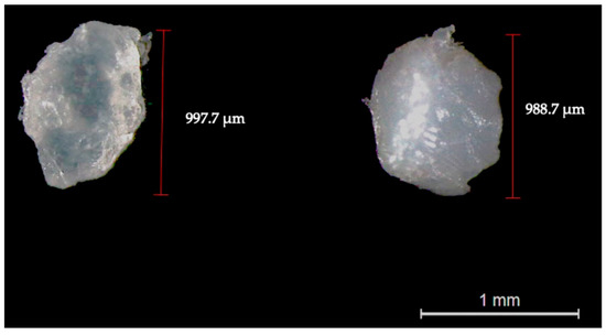 Representative image of pristine PLA (left side) and PET (right side) particles observed through binocular stereomicroscopy (magnification: 10×).