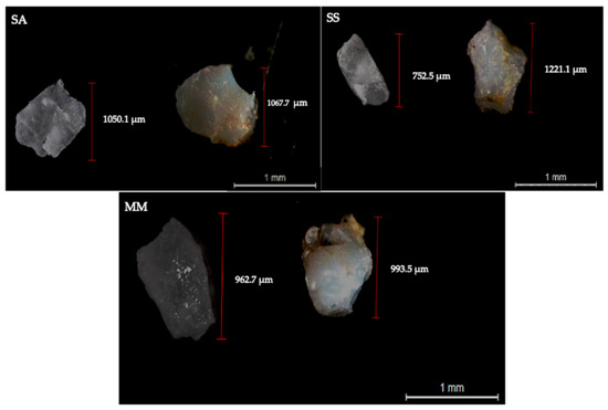 Representative images of PLA (left side) and PET (right side) particles recovered from the non-bioaccessible fraction upon seafood digestion (SA—S. aurata; SS—S. salar; MM—M. mercenaria), acquired through binocular stereomicroscope (magnification: 10×).