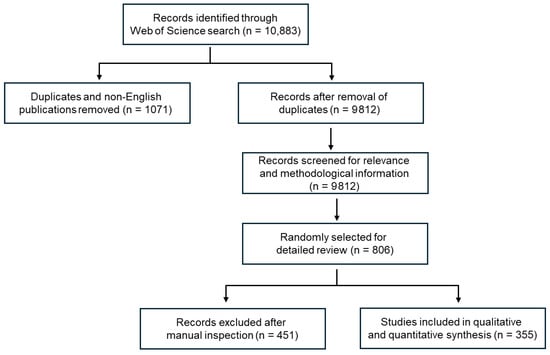 To derive a representative and manageable dataset suitable for detailed methodological assessment, a random sampling procedure was applied to the initial set, yielding 806 articles. Each article was screened manually to ensure relevance and adequate methodological information. Titles/abstracts and full texts were screened manually by two reviewers. Disagreements were resolved by discussion and/or a third reviewer. No automation tools were used for screening. After applying inclusion and exclusion criteria (Figure 2), 355 studies were retained for data extraction, while 451 publications were excluded. Excluded materials included review papers, experimental laboratory-only studies, modeling-only work, and studies focused solely on other matrices such as biota, tissues, or airborne particles. The final dataset therefore represents studies that directly sampled microplastics from freshwater, marine, or beach water and sediment compartments, providing sufficient methodological detail for comparative analysis.