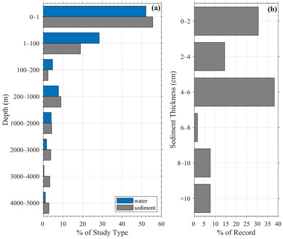 The sediment compartment includes riverbank, riverbed, beach, and seabed settings; thus, data are collected on or within sediment layers. Approximately 56% of sediment samples were retrieved from the upper 1 m, and an additional 19% from the 1–100 m layer (Figure 5a). Ultimately, microplastics in the water column sink and settle into sediments over time [61,62], with the top 5 cm layer consistently identified as holding the highest concentration due to recent deposition [46,47]. This aligns with our finding that at least 83% of studies sampled only the upper 6 cm of sediment, and about 15% extended to a depth of 8 cm. This pattern suggests an implicit assumption that surface sediment alone is sufficient to capture accumulation trends, but it also limits the ability to detect historical pollution layers.