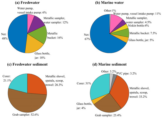 The types and sizes of microplastic collected in an environmental setting depend largely on the sampling instrument used [19,64,65,66]. In this section, we examine how microplastic data are collected in water and sediment compartments. Nets were the most common instrument for surface-water sampling in freshwater (n = 24; 48%; Figure 6a) and especially in marine waters (n = 134; 67%; Figure 6b). Nets used in these studies include Bongo, drift, Manta, multiple opening and closing, neuston, and plankton nets. Of these, Manta (n = 71), neuston (n = 42), and plankton (n = 30) nets accounted for nearly all reported net deployments. Glass bottles, metallic buckets, metallic samplers, and water samplers were more frequently used in freshwater sampling than in marine environments. The use of pumps was almost twice as common in marine sampling (11%) compared to freshwater sampling (6%). This contrast in choice of instrument likely reflects the available research infrastructure as much as it reflects methodological preference. Marine programs often operate from research vessels that are already equipped for net-based transects. In contrast, freshwater campaigns are typically more ad hoc and resource-limited, which shapes their instrument selection.