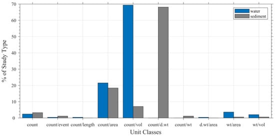 For sediments, concentrations expressed per dry weight (items/g d.w.) reduce variability due to moisture content and are more stable for comparison [19,83]. Count per area was the second most common unit class (21.5% for water and 18.4% for sediments), and while these may be convertible to volumetric or mass-normalized values, conversion is only robust when sampling depth, core thickness, or bulk density data are available. In many studies, however, these details were missing or ambiguously reported, preventing reliable conversion. This pattern suggests that even when publications report concentration values, the omission of contextual metadata effectively limits their harmonization potential.