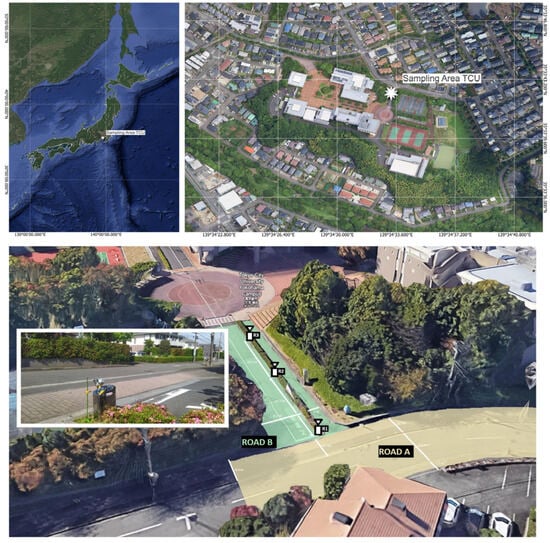 As shown in Figure 1, the university surroundings are dominated by residential houses. The road in front of the main gate (Road A) connects two major roads, Kuyakusho-dori and Hiyoshimotoishikawasen, and serves as a shortcut for drivers avoiding traffic lights. Sampling was conducted on Road B, which runs perpendicular to Road A, and serves as the only vehicle-accessible university entrance site. Other gates exist but are restricted to pedestrians and cyclists.