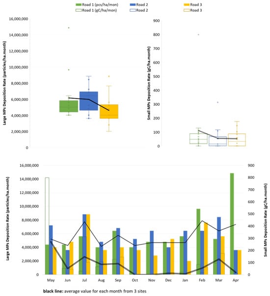 Microplastic deposition rate: large MPs (0.3–5 mm, upper left) and small MPs (45–300 μm, upper right) by site, with monthly deposition (bottom).