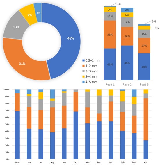 The dominant particle sizes observed were as follows: ≥0.3–1 mm (46%), 1–2 mm (31%), 2–3 mm (13%), 3–4 mm (7%), 4–5 mm (3%) (Figure 3). Detailed monthly and site-specific distributions are shown in Figure 3. All five sizes were detected at each site, with the smallest two categories (≥0.3–1 mm and 1–2 mm) dominating across all locations, which is consistent with results from previous studies where smaller particles were found to be more abundant [7,8]. For example, in the Kosovo highway study, only three MPs larger than 2.5 mm were found among 107.7 MPs/day, indicating that smaller particles dominate atmospheric deposition [7]. Similar findings (Table 2) were reported for the road dust and runoff samples in Japan, where particles sized <500 μm were most abundant [17,21]. International studies have similarly shown that fine MPs (20–100 μm) dominate in both atmospheric and wet deposition samples [74,75]. These findings about the smaller dominant sizes of MPs are also consistent with other observations from atmospheric MPs deposition studies [11,33,43,45].