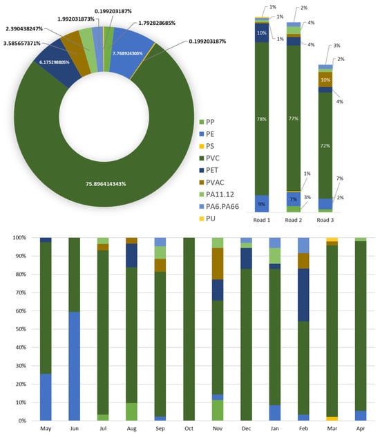 Nine polymers were identified, with polyvinyl chloride (PVC) being the most prevalent (76.1%), followed by polyethylene (PE, 7.8%), polyethylene terephthalate (PET, 6.2%), polyvinyl acetate (PVAC, 3.6%), polyamide 11 and 12 (PA11.12, 2.4%), polyamide 6 and 66 (PA6/66, 2.0%), polypropylene (PP, 1.8%), polystyrene (PS, 0.2%), and polyurethane (PU, 0.2%). The polymer distribution varied slightly among sites and months (Figure 4).