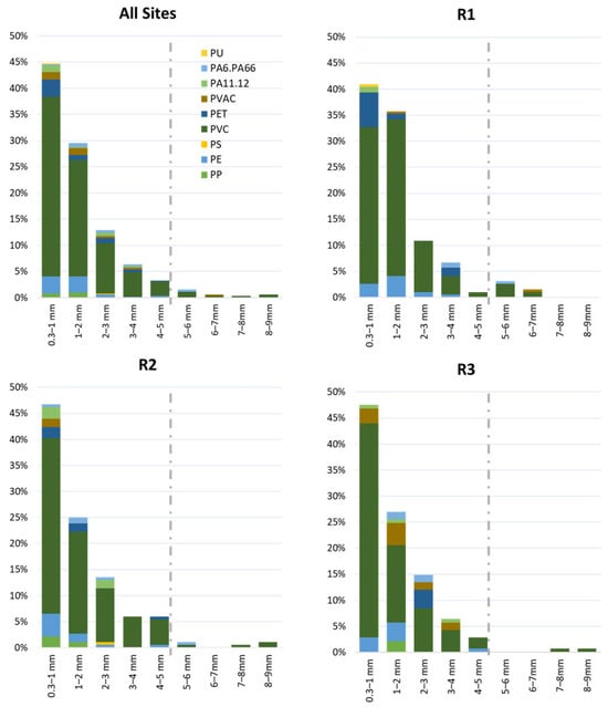 Size distribution of large MPs polymer types across all sites and individual sites (R1, R2, R3). Abbreviations: PP (polypropylene), PE (polyethylene), PS (polystyrene), PVC (polyvinyl chloride), PET (polyethylene terephthalate), PVAC (polyvinyl acetate), PA11.12, PA6/66 (Polyamide), PES (polyester), and PU (polyurethane).