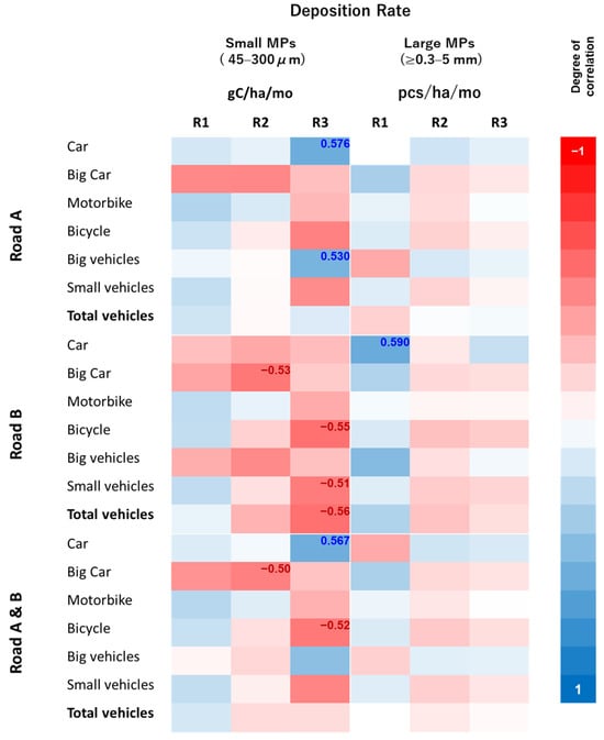 Deposition data for both large (≥0.3–5 mm) and small MPs (45–300 μm) were analyzed across all three sampling sites (R1, R2 and R3). Road A has a higher traffic volume than Road B, including all motorized vehicle types, but excluding bicycles. The overall deposition pattern (Figure 2) generally agrees with the findings of Gao et al. [34], suggesting that road proximity may influence particle deposition. Since sampling site R1 is the closest to Road A, we hypothesized that heavier traffic would result in higher MP deposition rates.