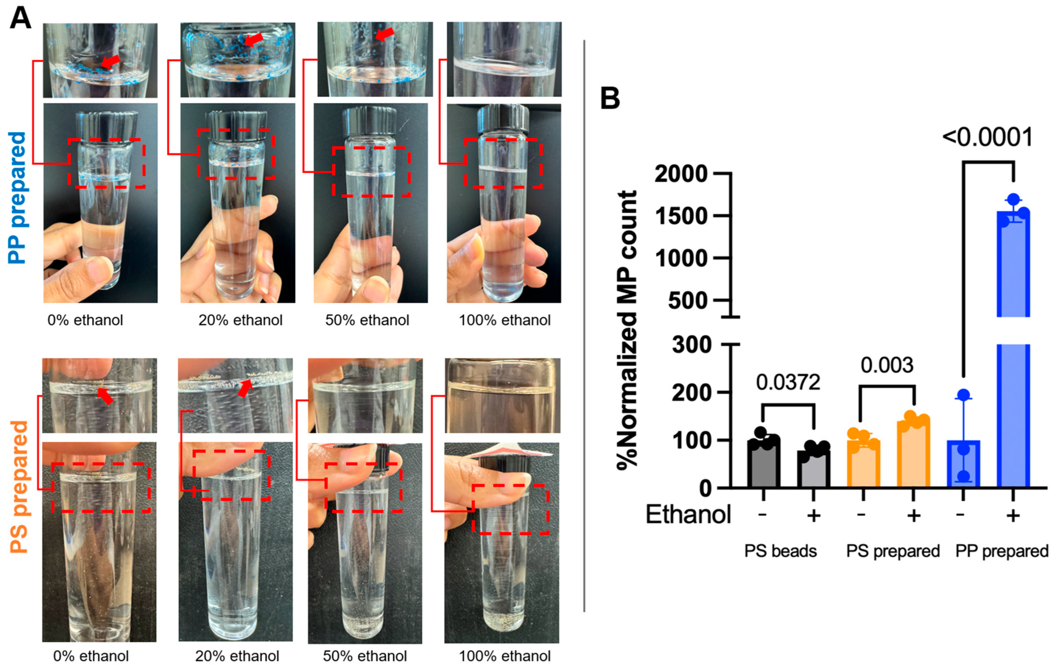 4.2. Ethanol-Based Solvents Enhance the Recovery of MPs with Irregular Shapes