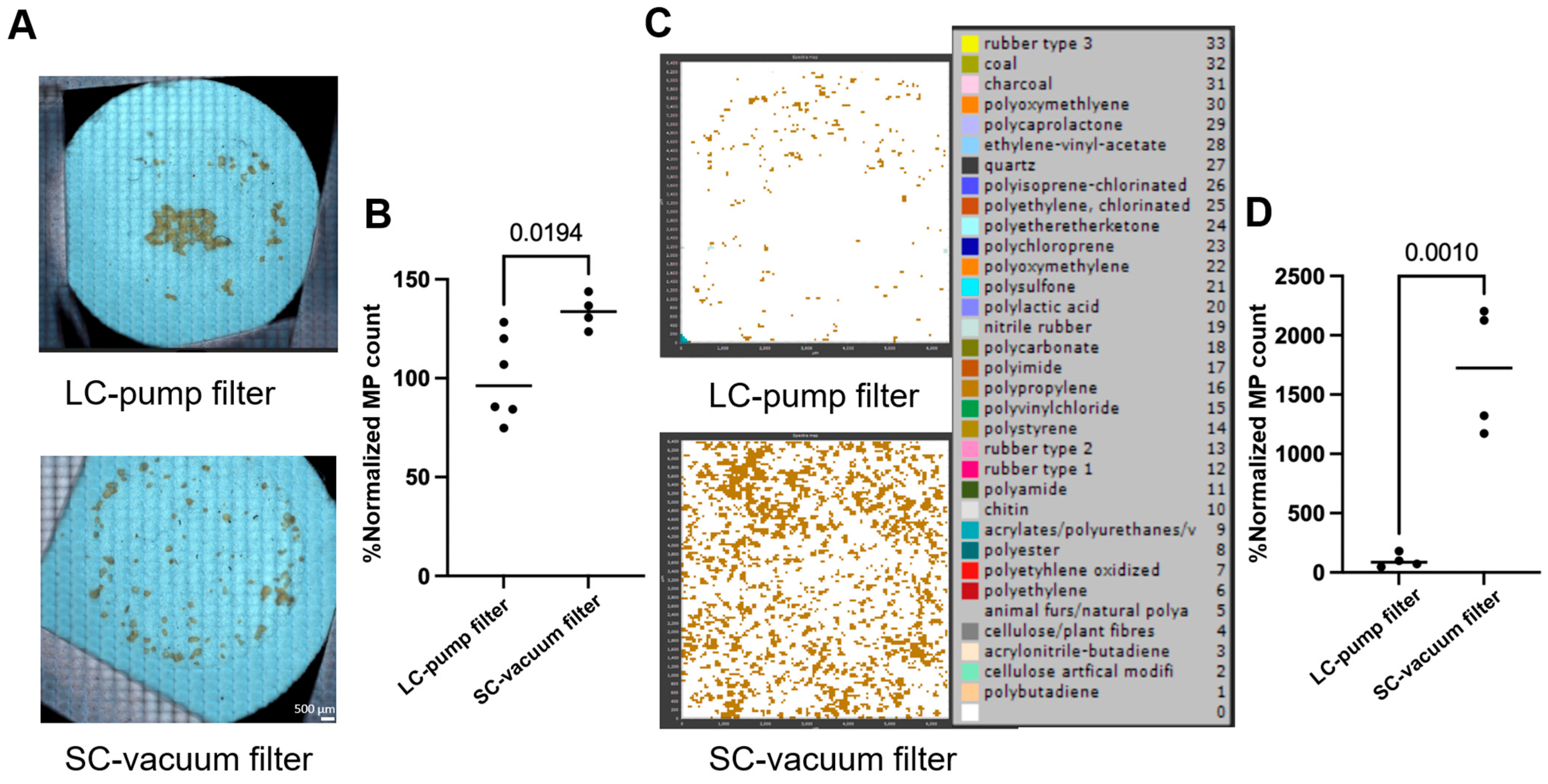4.3. Short-Circuit Vacuum Filtration Is Superior to Long-Circuit Pump Filtration in Terms of MP Counts