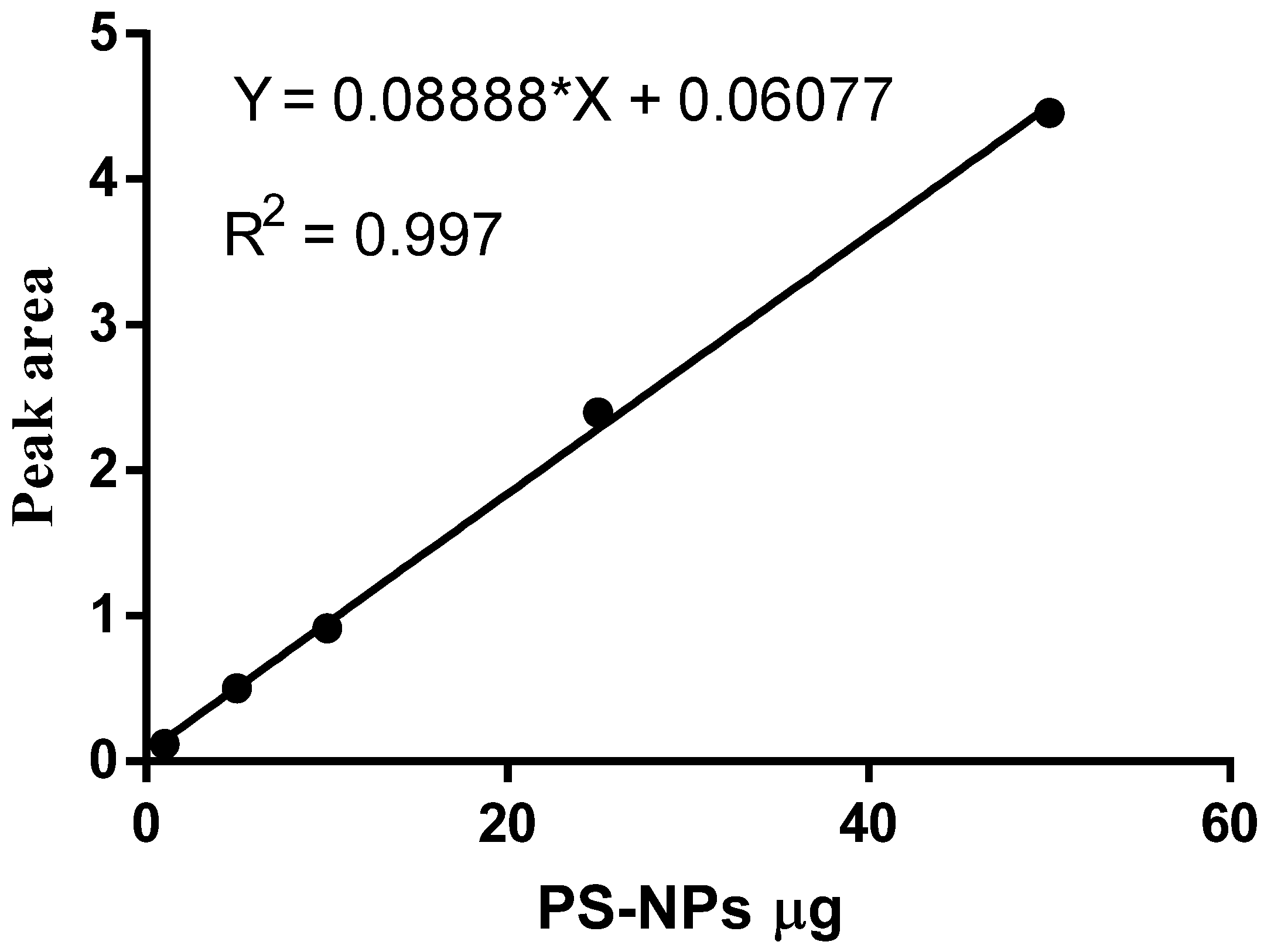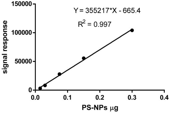A calibration curve for the pyro-GCMS method was prepared using the PS-NPs (500 nm) at five different masses: 0.015, 0.03, 0.075, 0.15 and 0.3 µg. The calibration and linearity range was assessed by injecting the PS-NPs in increasing amounts and then measuring the response signal for each PS peak in the fractogram. M/Z 104 was used for quantification of the styrene peak. Calibration curves (Figure 3) were obtained by plotting the calculated peak areas versus the PS-NP mass. For simplicity, the lowest calibration standard included in the calibration curve was used as the limit of detection of the instrument. Due to different volumes of the samples analyzed, the method’s detection limit (MDL) ranged from 1 to 3.75 µg for samples first collected from the AF4, and from 0.5 to 0.75 µg for sample extracts analyzed directly by pyro-GCMS.