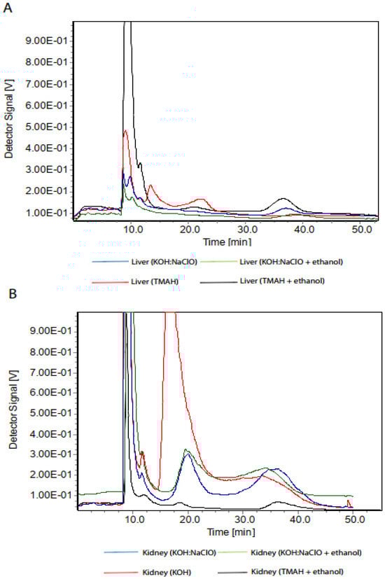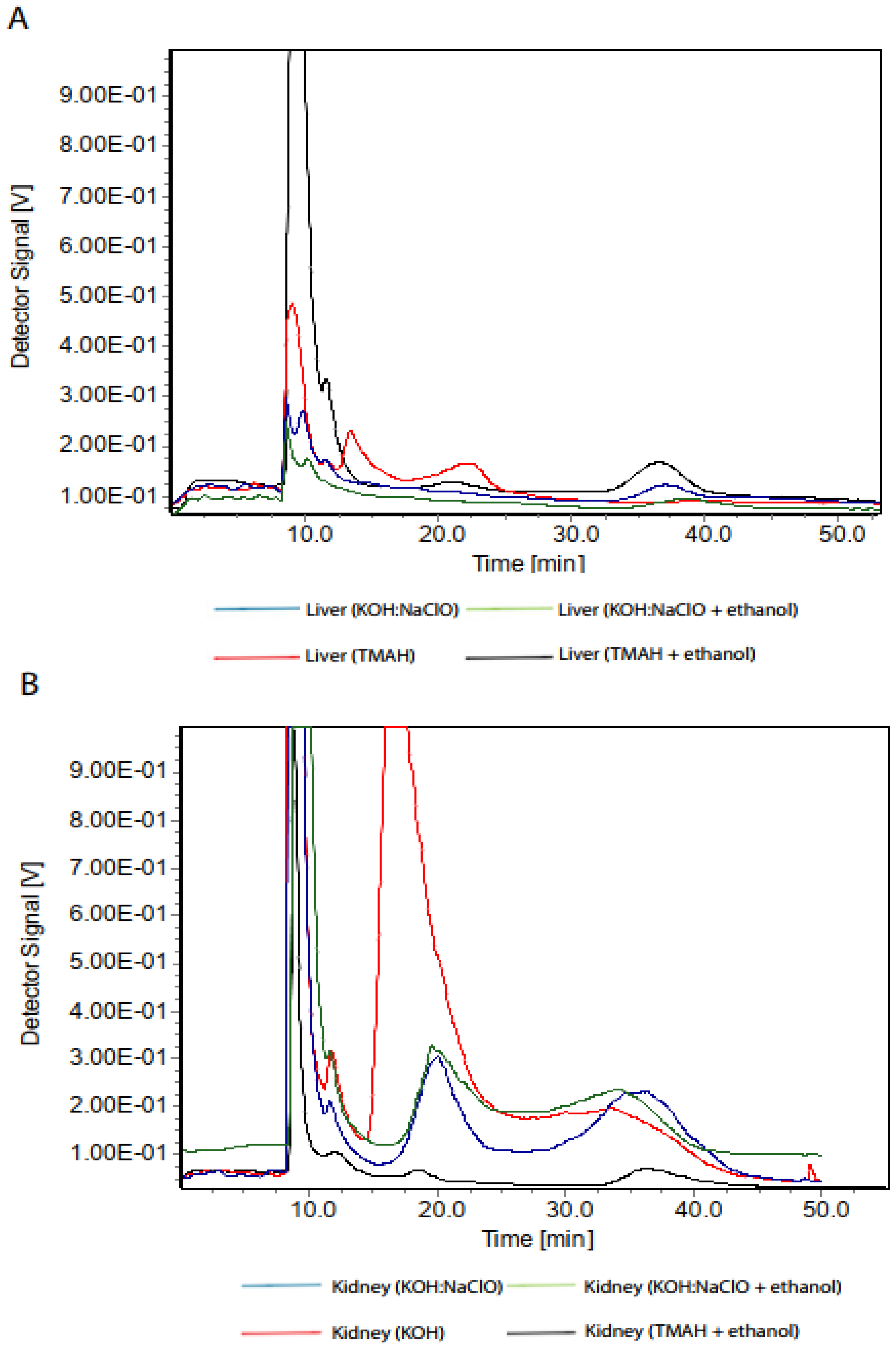A summary of experiments conducted with rodent tissues spiked with PS-NPs can be found in Table 6. Tissues were spiked using 70.2 µg and 54 µg of 50 nm and 500 nm PS-NPs, respectively, and then processed using the tissue-specific methodology and digestions as outlined above. The recovery using AF4-UV-DLS for the 50 nm particles was the highest in the liver (81.5%), followed by the intestine (79.5%), spleen (78.3%) and kidney (68.9%). For the 500 nm spiked tissues, the recovery was approximately 100% in both intestine and liver, whereas in the spleen and kidney, the recovery was approximately 83% and 48.0%, respectively. Some sample AF4 fractograms are presented in Figure 4 showing varying rates of recovery in the liver (Figure 4A) and kidney (Figure 4B) using different digestion buffers. Using pyro-GCMS, the recovery for 50 nm particles was much lower: spleen (47.0%), kidney (24.3%), intestine (34.9%) and liver (30.2%). Recovery for the 500 nm particles was as follows: spleen (51.2%), intestine (69.6%), liver (55.1%) and the kidney (40.9%). In summary, quantification via AF4-UV-DLS shows good recovery for most organs, with the possible exception of the kidney. Following AF4-UV-DLS peak isolation and subsequent pyro-GCMS, analysis shows decreasing recovery rates similar to those found in the water experiments presented in Table 6 for the equivalent mass of particles analyzed. The data shows that even with optimized protocols, handling methods and matrix effects still result in a significant but predictable loss in quantifiable mass with more pronounced loss in the pyro-GCMS method of analysis.