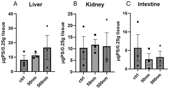 AF4 analysis was unable to detect any PS-NPs in rodent tissue after 24 h of exposure to either 50 or 500 nm PS-NPs; thus, the samples were used directly for pyro-GCMS. Using this method, we were able to recover varying amounts of PS from various tissues. Although some biological matrix remained, PS-NP was progressively detected in the liver (Figure 5A) and kidney (Figure 5B). In contrast, intestinal sample results were too inconsistent to reach a conclusion about PS-NP detection (Figure 5C). Our method of tissue digestion and pyro-GCMS presented in this work has been able to detect PS-NPs in the liver and kidneys of mice exposed to PS-NPs in vivo even without AF4 processing, demonstrating its viability as a method of PS-NP quantification in biological tissues at very low concentrations.