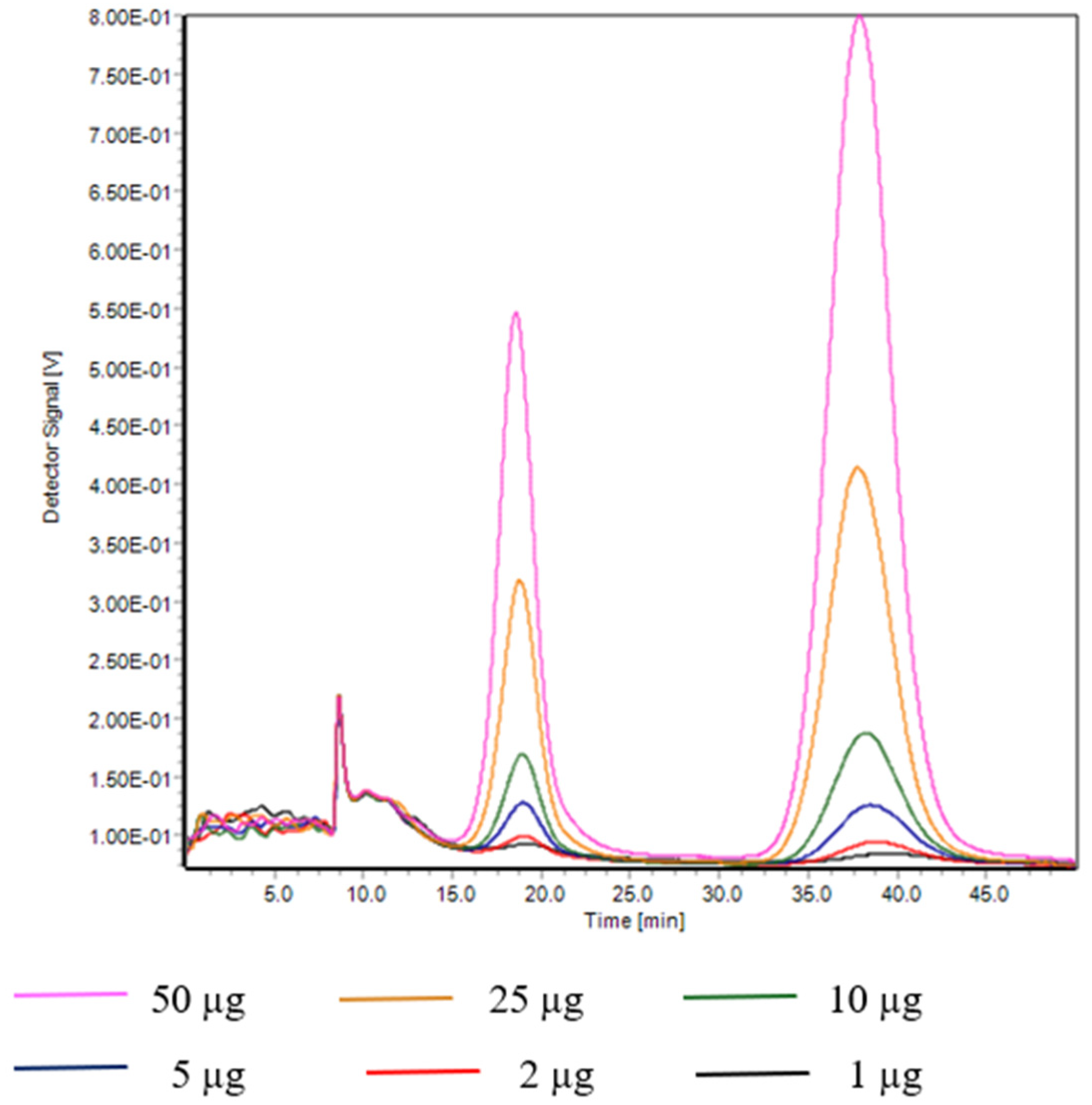 A calibration curve for the AF4 method was prepared using two different sizes of PS-NP particles (50 nm and 500 nm) at six different masses: 1.0, 2.0, 5, 10, 25 and 50 µg. The calibration and linearity range was assessed by injecting the PS-NPs in increasing amounts and then measuring the UV signal for each PS peak in the fractogram (Figure 1). Calibration curves (Figure 2) were obtained by plotting the calculated peak areas versus the PS-NP mass. The limit of detection (LOD, 0.157 µg) and limit of quantification (LOQ, 0.477 µg) were determined for AF4-UV-DLS measurements.