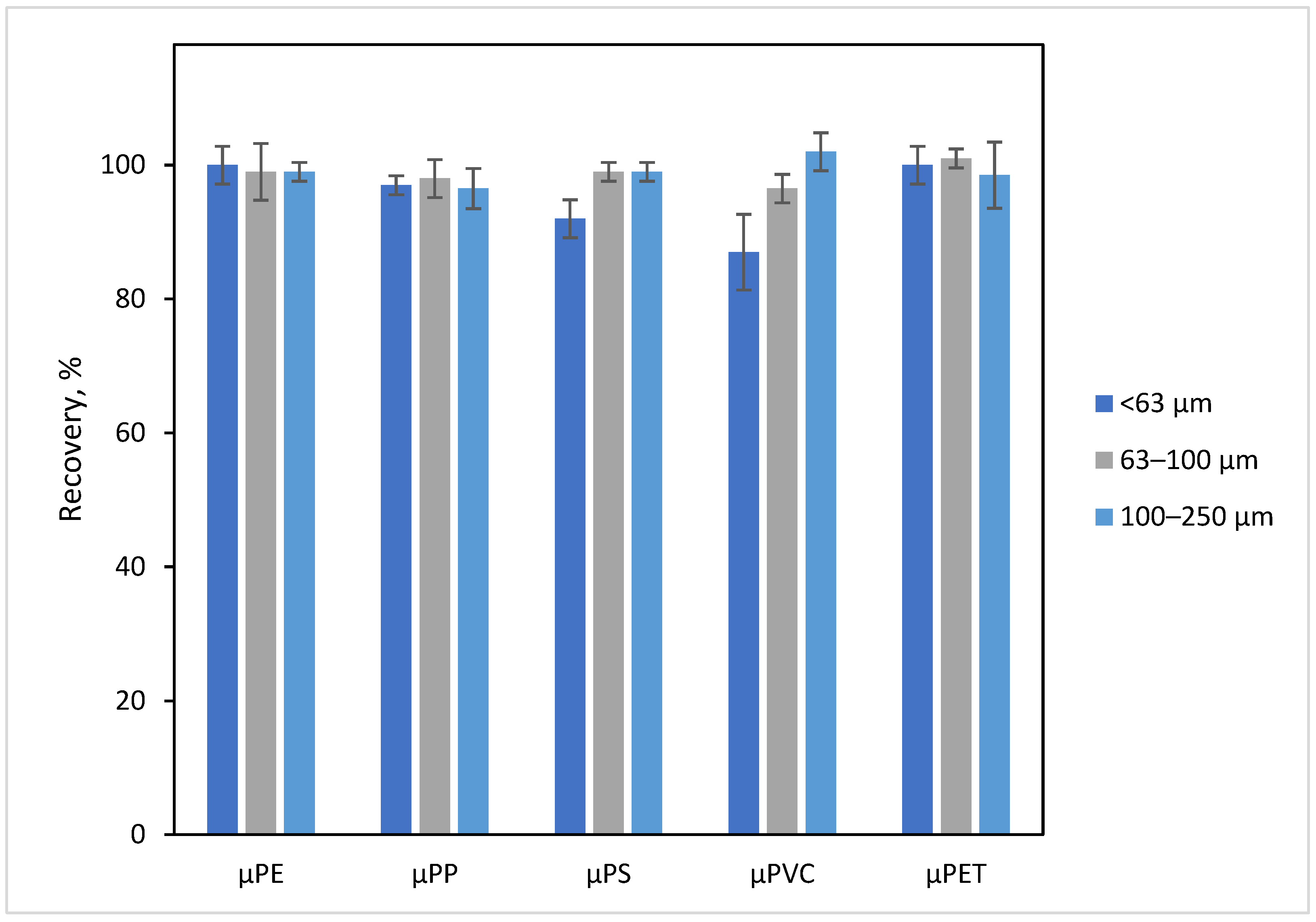 | 100–250 μm | 99 ± 1 | 97 ± 3 | 99 ± 1 | 102 ± 3 | 99 ± 5 |
