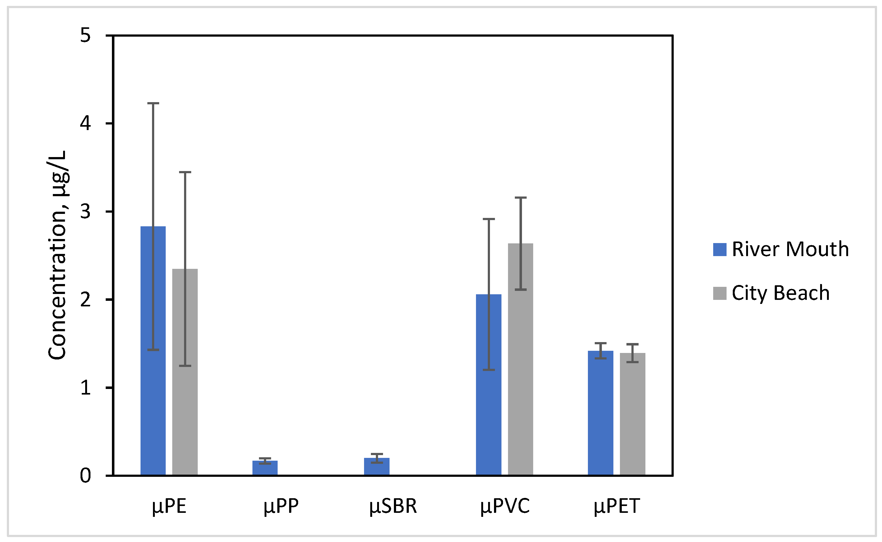 | Microplastic | LOQ *, μg | Concentration, μg/L | |