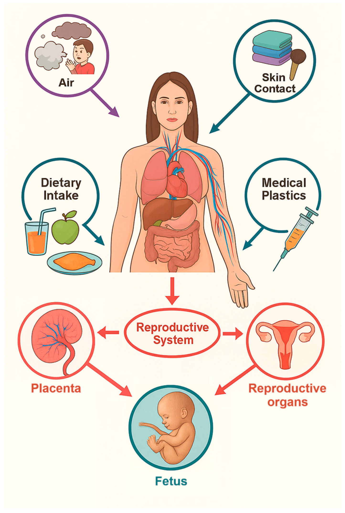 - Balali, H.; Morabbi, A.; Karimian, M. Concerning Influences of Micro/Nano Plastics on Female Reproductive Health: Focusing on Cellular and Molecular Pathways from Animal Models to Human Studies. Reprod. Biol. Endocrinol. 2024, 22, 141. [Google Scholar] [CrossRef]