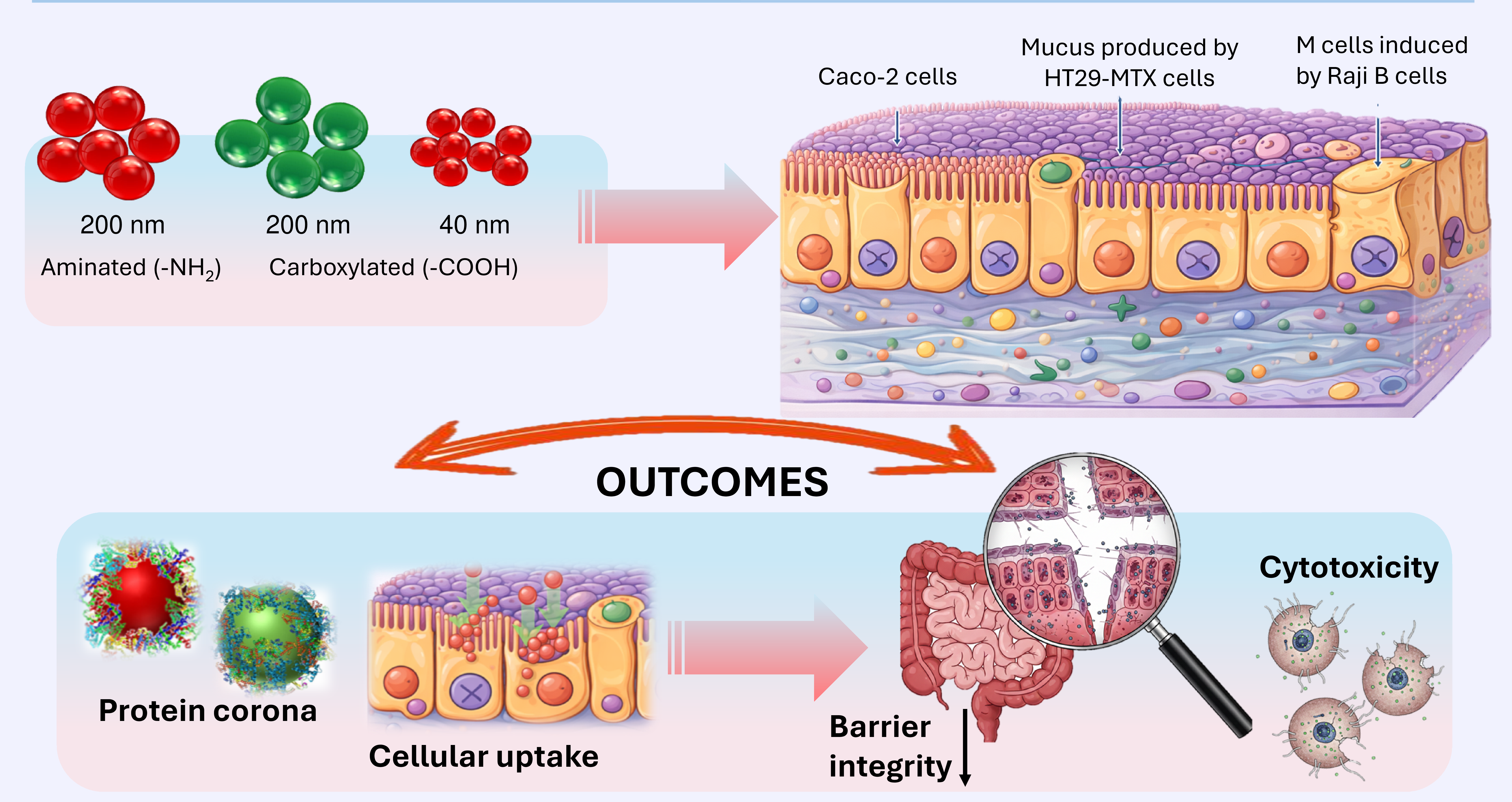 In this study, we investigated the impact of different-sized and functionalized fluorescent carboxylate-modified polystyrene beads (200 and 40 nm (-COOH beads), green and red, respectively) and amine-modified polystyrene beads (-NH2 beads) (200 nm, red) on an in vitro gastrointestinal barrier model developed with a tri-culture of Caco-2, HT29-MTX, and Raji B cell lines to best represent the different cell types present in the human gastrointestinal barrier.