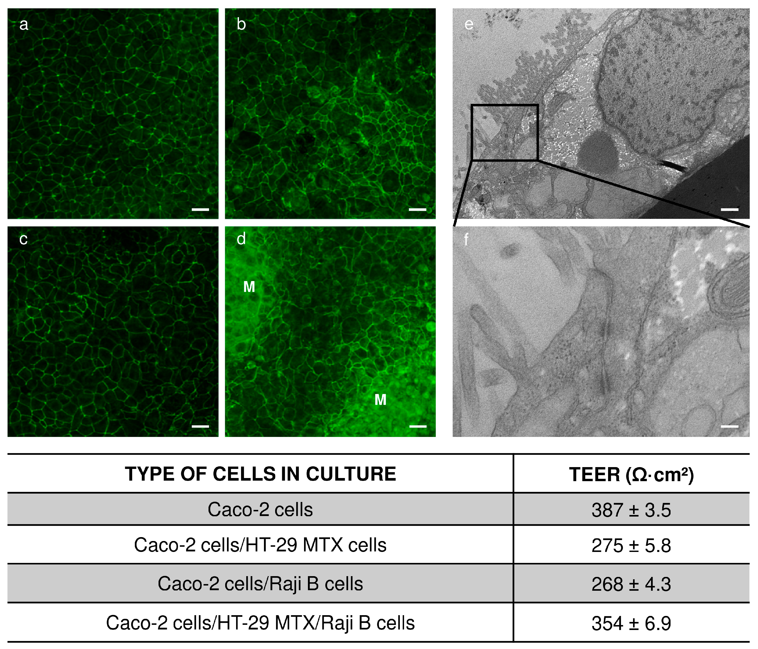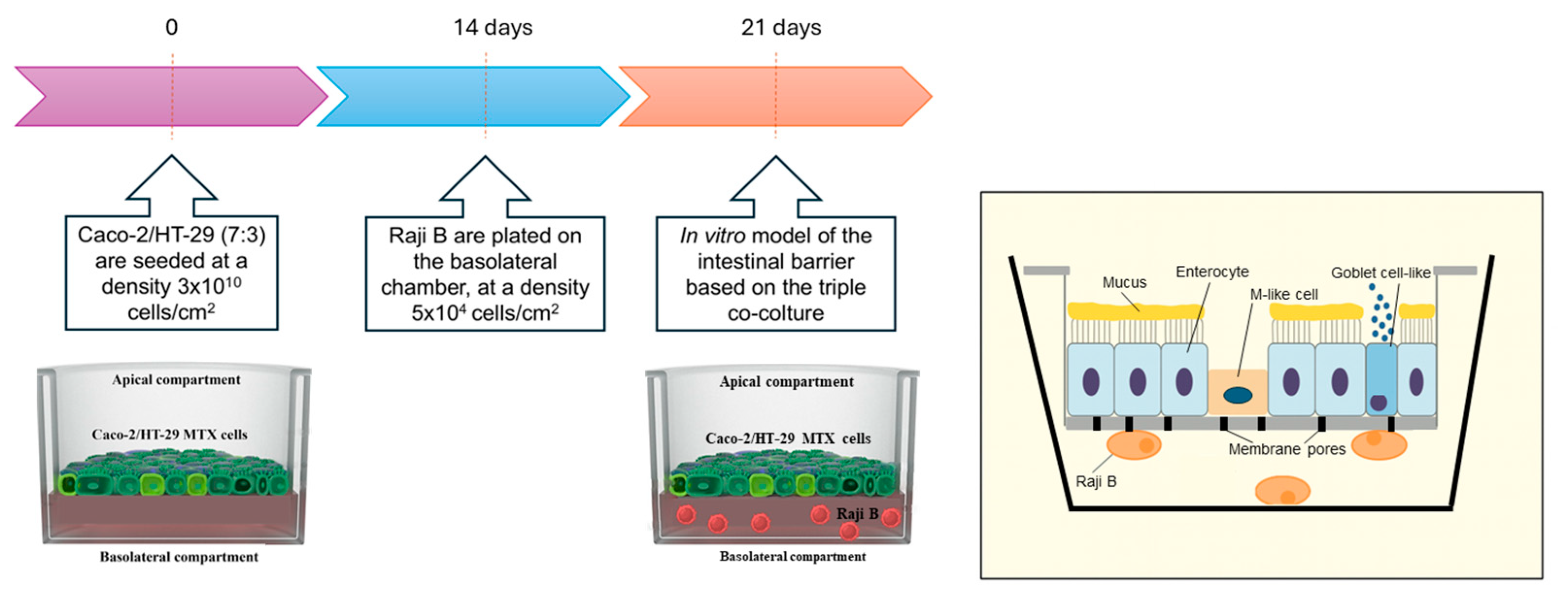 Figure 1). To optimize the development of the tri-culture intestinal barrier model, a comparative approach was employed wherein cells were cultivated not only in the tri-culture system but also in simpler models, including mono-culture (Caco-2) and co-culture systems (Caco-2/HT29 and Caco-2/Raji B). This comparison allowed for a detailed evaluation of the distinct morphological, functional, and barrier properties characteristic of each culture condition. The morphology of the cell culture was observed by using a light microscope Eclipse 80i (Nikon, Tokyo, Japan).
