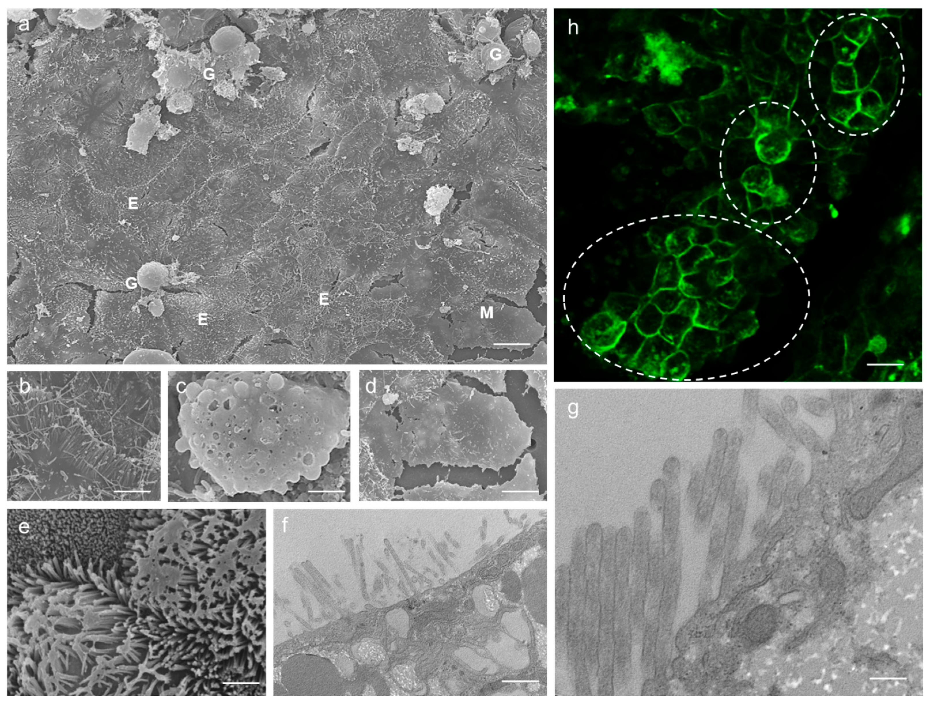 The SEM analysis performed on the 3D culture revealed the cell types characterizing the gastrointestinal barrier, i.e., enterocytes (E), goblet-like cells (G), and M cells (M) (
