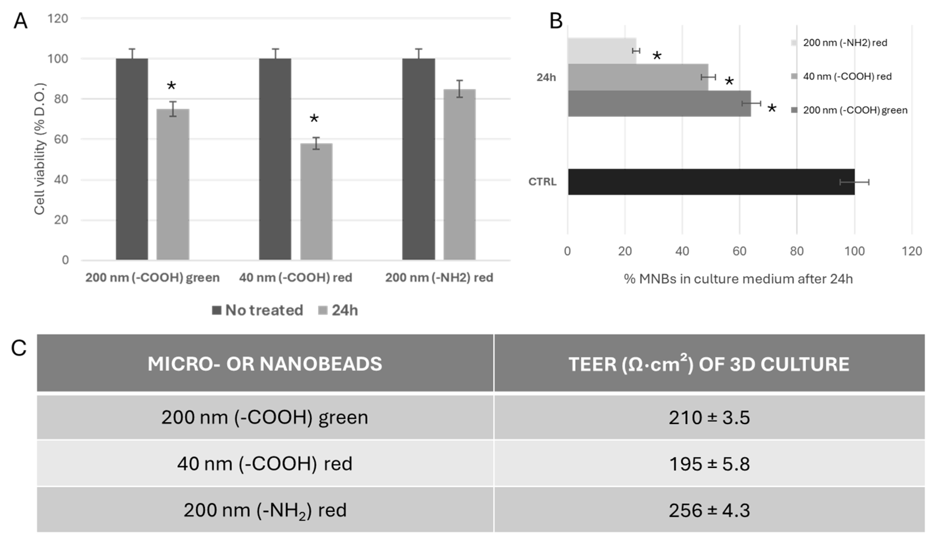 2) red beads. This outcome suggests that smaller particles with carboxylate surface groups disrupt the intestinal epithelium more efficiently than larger or aminated beads. Recent research confirms that nanoparticle size and charge are pivotal in determining epithelial disruption and permeability: negatively charged surfaces such as –COOH can interact more strongly with cell membranes and tight junction proteins, impairing barrier resistance measured as TEER [
