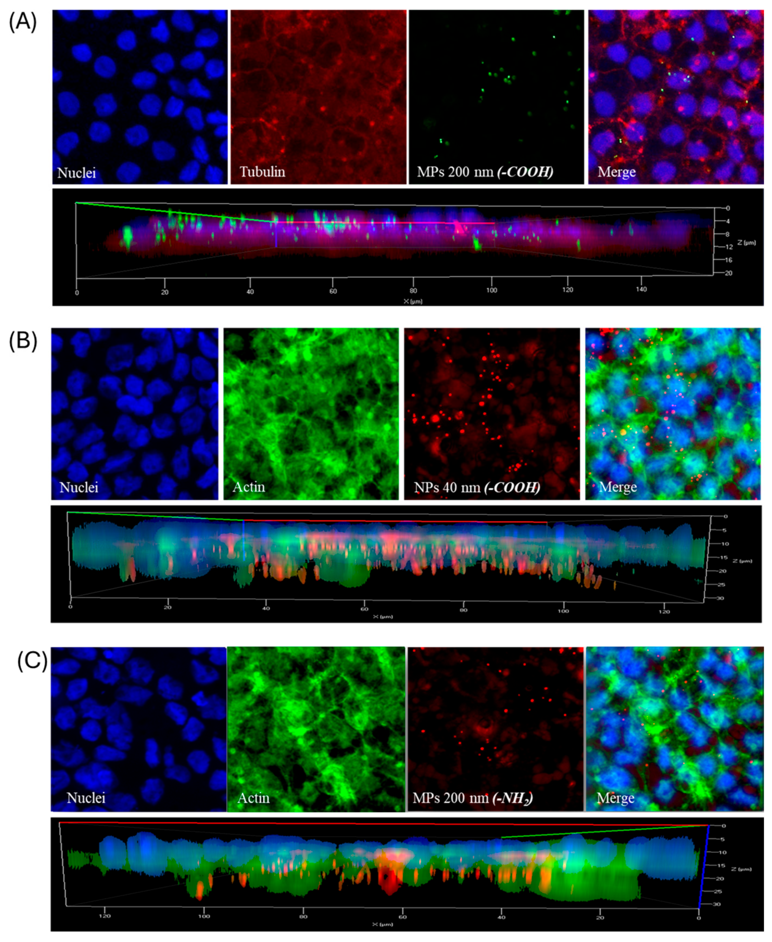 Confocal microscopy analysis confirmed that all tested polystyrene particles were successfully internalized by our gastrointestinal barrier model, demonstrating their strong ability to penetrate cellular barriers, as shown in the confocal and z-stack mode images reported in