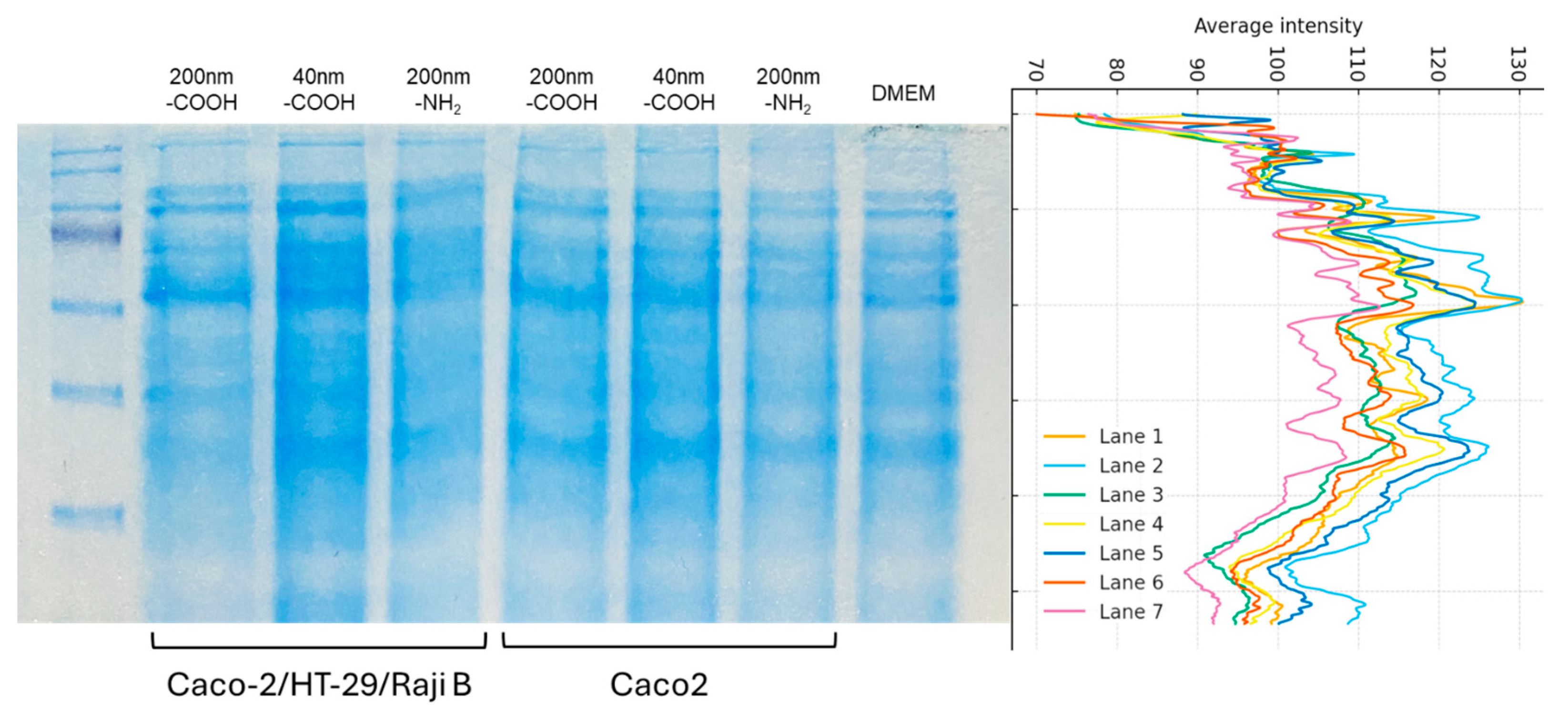 In the Caco-2 mono-culture, the 200 nm -COOH beads (Lane 4) showed a pronounced enrichment of high-molecular-weight proteins, similar to that observed in the 40 nm -COOH beads under tri-culture conditions. This indicates that even the epithelial cell line alone produces large proteins capable of interacting with carboxylated surfaces. The 40 nm -COOH beads in mono-culture (Lane 5), however, appeared less enriched in large proteins than their tri-culture counterpart, implying that the presence of HT29 and Raji B cells provides additional secreted factors that promote the adsorption of large proteins onto small nanobeads. The 200 nm -NH