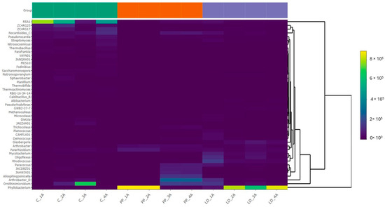 On the other hand, a β-diversity analysis was performed to assess differences among bacterial communities of the three types of microbiomes (PP, LDPE and bulk soil) at the genus level. For this purpose, a dissimilarity matrix using the Bray–Curtis distance was generated and used as the input of a hierarchical clustering analysis and heatmap (Figure 1). Bacterial communities from the three different microbiomes were clustered according to their composition and structure, indicating that all groups of bacterial communities were separated from each other (Figure 1).
