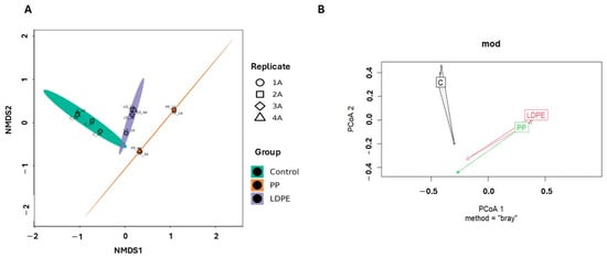 The previously constructed Bray–Curtis distance matrix was utilized to generate a Non-Metric Multidimensional Scaling (NMDS) plot and the analysis of similarity (ANOSIM) [46]. The NMDS plot showed that the bacterial community exhibited significant compositional and structural differences across the three groups of microbiomes (Figure 2A), with an NMDS stress value of 0.026, indicating an appropriate fit for the chosen dimensions, thus representing reliable dissimilarities between the microbiomes under study. These differences were supported by the results of the ANOSIM, which revealed a statistically significant distinction among groups (R = 0.468; p = 0.0162), indicating a moderate degree of dissimilarity in bacterial community composition between groups of different microbiomes, and how the presence or absence of synthetic plastics (polyethylene or polypropylene) influenced their composition. Additionally, the Bray–Curtis distance matrix was used to perform a PERMANOVA in R, using the vegan package [42]. The multivariate homogeneity of group dispersions was previously assessed using the betadisper function, which showed no significant dispersion among different plastispheres or control communities (ANOVA F-value = 0.5225; p-value = 0.61). The PERMANOVA analysis yielded a p-value of 0.012 and an F-value of 3.636, which is considered statistically significant, supporting strong evidence to reject the null hypothesis that microbiome compositions (groups) are the same (Table S6).