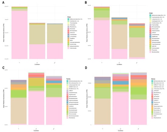 Mean relative abundance of most representative taxa in the microbiomes analyzed. Mean relative abundance (stacked bar plots), represented as counts per million (CPM) of the 15 most abundant taxonomic groups and those exclusive to each condition, is shown in X axis: C, bulk soil control; LD, low-density polyethylene; and PP, polypropylene. Taxonomic abundances for levels higher than genus were calculated by the summatory of CPM values of their constituent lower-rank taxa. Taxa that were not identified among the top 15 or were not exclusive were grouped into the category of others. Four taxa are represented: class (A), order (B), family (C), genus (D).