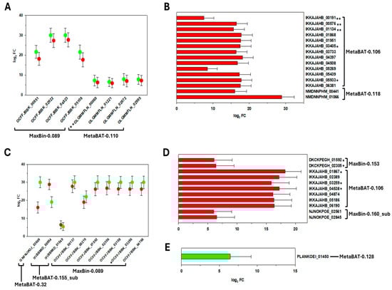 Differential analyses of lipase and esterase gene relative abundance enriched in LDPE and PP plastispheres with DESeq2 software. The represented values are expressed as log2 fold change (log2 FC) of gene relative abundances in LDPE/bulk soil control (red) and in PP/bulk soil control (green). In the analysis of LDPE versus bulk soil control or PP versus bulk soil control, positive values show higher gene abundance in LDPE (or PP) than in control. (*) indicates predicted secreted proteins and (**) represents putative outer-membrane proteins according to UniProt (https://www.uniprot.org accessed on 10 July 2002). Only values with log2 FC > 1 and p-value < 0.05 were considered. Taxonomic assignments are indicated on the legend at the lowest level available. Lipases shared between LDPE and PP (A): MaxBin-0.089 (Phyllobacterium): OCFFJBBK_00851, lysophospholipase L2; OCFFJBBK_02922, thermostable monoacylglycerol lipase; OCFFJBBK_04823, non-hemolytic phospholipase C; OCFFJBBK_05108, monoacylglycerol lipase. MetaBAT-0.110 (Pseudorhodoferax): OLGMMFLN_00060, putative phospholipase A1; OLGMMFLN_01221, non-hemolytic phospholipase C; OLGMMFLN_02872, non-hemolytic phospholipase C; and OLGMMFLN_02995, non-hemolytic phospholipase C. Lipases exclusive to LDPE (B): MetaBAT-0.106 (Oligoflexus): IKKAJAHB_00191, lipase 1; IKKAJAHB_00576, lipase 1; IKKAJAHB_01134, lipase 1; IKKAJAHB_01868, lysophospholipase L2; IKKAJAHB_01951, lysophospholipase L2; IKKAJAHB_03405, phospholipase D; IKKAJAHB_03733, lysophospholipase L2; IKKAJAHB_04397, lysophospholipase L2; IKKAJAHB_04508, lysophospholipase L2; IKKAJAHB_05269, monoacylglycerol lipase; IKKAJAHB_05439, lipase 1; IKKAJAHB_05933, triacylglycerol lipase, IKKAJAHB_06381, lysophospholipase L2. MetaBAT-0.118 (Clostridia): NMDNNPHM_00441, thermostable monoacylglycerol lipase; and NMDNNPHM_01066 and phospholipase YtpA. Esterases shared between LDPE and PP (C): MetaBAT-0.32 (Rhizobium): GNFNJPOJ_03606, acetyl esterase. MetaBAT-0.155_sub (Deinococcus): IFIBBMID_00954, phosphatase/phosphodiesterase; IFIBBMID_01049, acetyl esterase. MaxBin-0.089 (Phylobacterium): OCFFJBBK_00137, 3S-malyl-CoA thioesterase; OCFFJBBK_00219, acyl-CoA thioesterase 2; OCFFJBBK_01092, acyl-CoA thioesterase YbgC; OCFFJBBK_02306, acetyl esterase; OCFFJBBK_03108, acetyl esterase; OCFFJBBK_03286, cellulase/esterase CelE; and OCFFJBBK_04766, esterase EstB. Esterases exclusive to LDPE (D): MaxBin-0.153 (Bacteroidota): DKCKPEGH_01592, glycerophosphodiester phosphodiesterase; DKCKPEGH_02305, cellulase/esterase CelE. MetaBAT-0.106 (Oligoflexus): IKKAJAHB_01867, glycerophosphodiester phosphodiesterase; IKKAJAHB_02389, acyl-CoA thioesterase 2; IKKAJAHB_03259, cellulase/esterase CelE; IKKAJAHB_04538, esterase TesA; IKKAJAHB_04874, acetyl esterase; IKKAJAHB_05186, pimeloyl-[acyl-carrier protein] methyl ester esterase; IKKAJAHB_06190, putative esterase. MaxBin-0.160_sub (Oscillatoriales): NJNOKPOE_02561, carboxylesterase 2; and NJNOKPOE_02845, acetyl esterase. Esterase exclusive to PP (E): MetaBAT-0.128 (Pseudomonadota): PLANKOEI_01450.