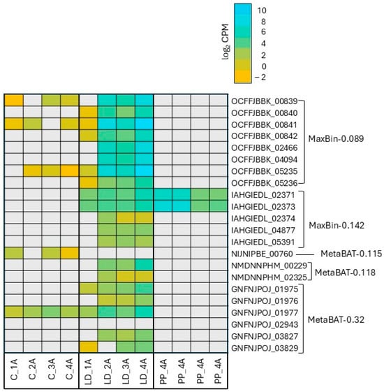 Relative abundance of sarcosine oxidase (sox) genes. The represented values indicate gene relative abundance, as CPM (counts per million), and correspond to the log2 of relative abundance of genes present in a least 3 of the 4 replicates of each microbiome, bulk soil control (C_1A-4A), LDPE (LD_1A-4A) and PP (PP_1A-4A). Grey colour indicates that this gene was not detected in at least 3 of the 4 replicates of each microbiome. Metagenome-assembled genomes with sox genes identified in this study and their taxonomic assignments (at the lowest level achieved). These genes were present in MaxBin-0.089 (Phyllobacterium), MaxBin-0.142 (Micrococcaceae), MetaBAT-0.115 (Candidatus Nitrosocosmicus franklandus), MetaBAT-0.118 (Clostridia) and MetaBAT-0.32 (Rhizobium sp. root482).