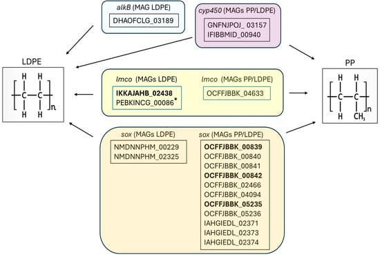 - Further oxidative reactions might occur on LDPE and PP polymers. In the case of LDPE cytoplasmic cytochrome P450, alkane monooxygenase, laccase-like multicopper oxidase and peroxidase genes have been identified (Figure 5 and Figure 7). Genes with potential biodeterioration oxidative functions in PP have also been identified, including cytochrome P450, laccase-like multicopper oxidases and peroxidase genes (Figure 5 and Figure 7). Non-hydrolyzable polymers like polyethylene and polypropylene have been described to be more likely degraded through oxidative enzymes, such as monooxygenases (cytochrome P450 and alkane monooxygenases), ligninolytic enzymes like laccases, manganese peroxidases, lignin peroxidases, and other unspecified peroxygenases [72].
