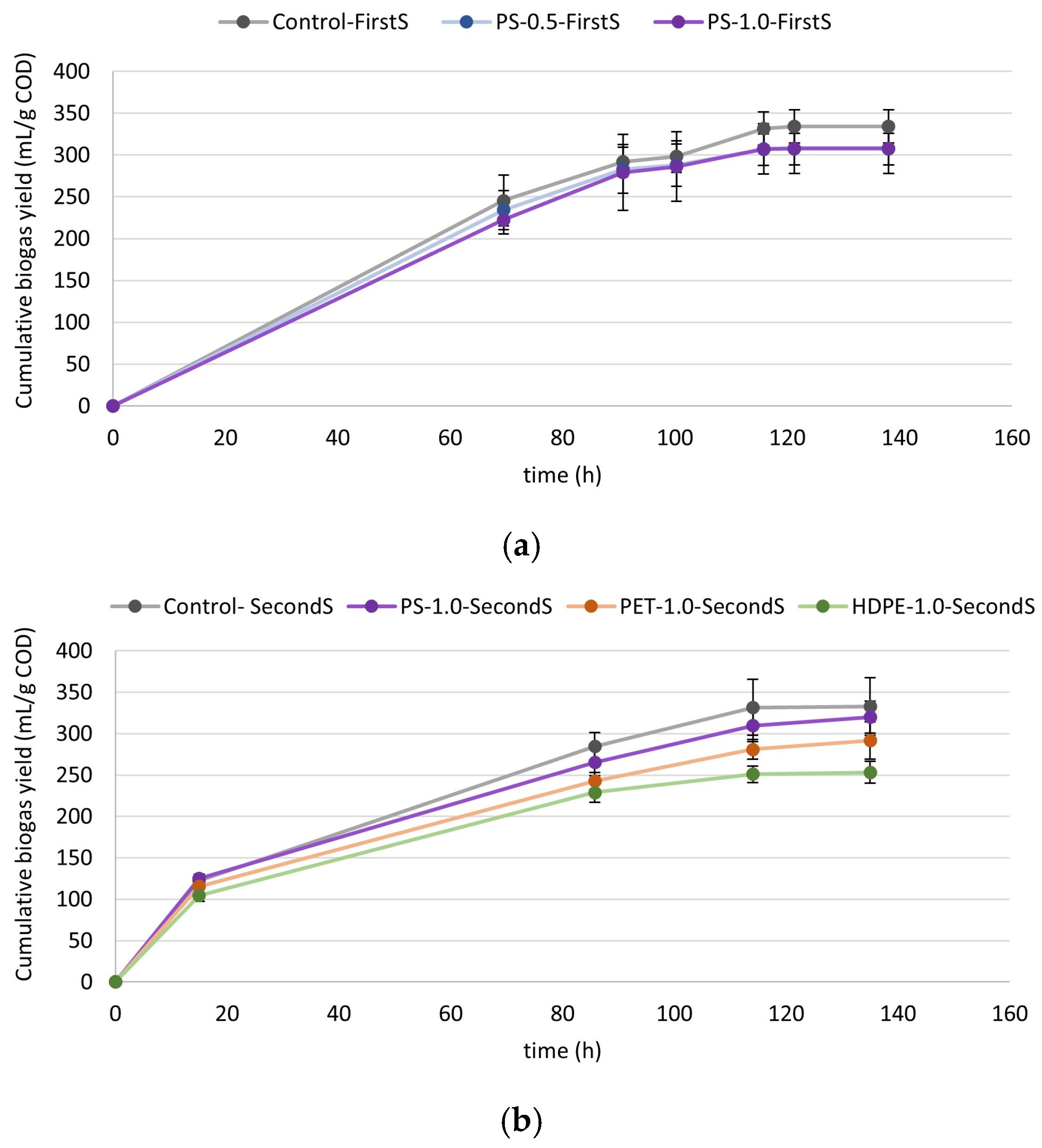 Figure 5a). This result was expected since a highly biodegradable substrate should enhance microbial activity and overall digestion efficiency, helping to overcome the negative impacts of the MPs present in the feed (HDS) due to its nutrient composition and biodegradability [