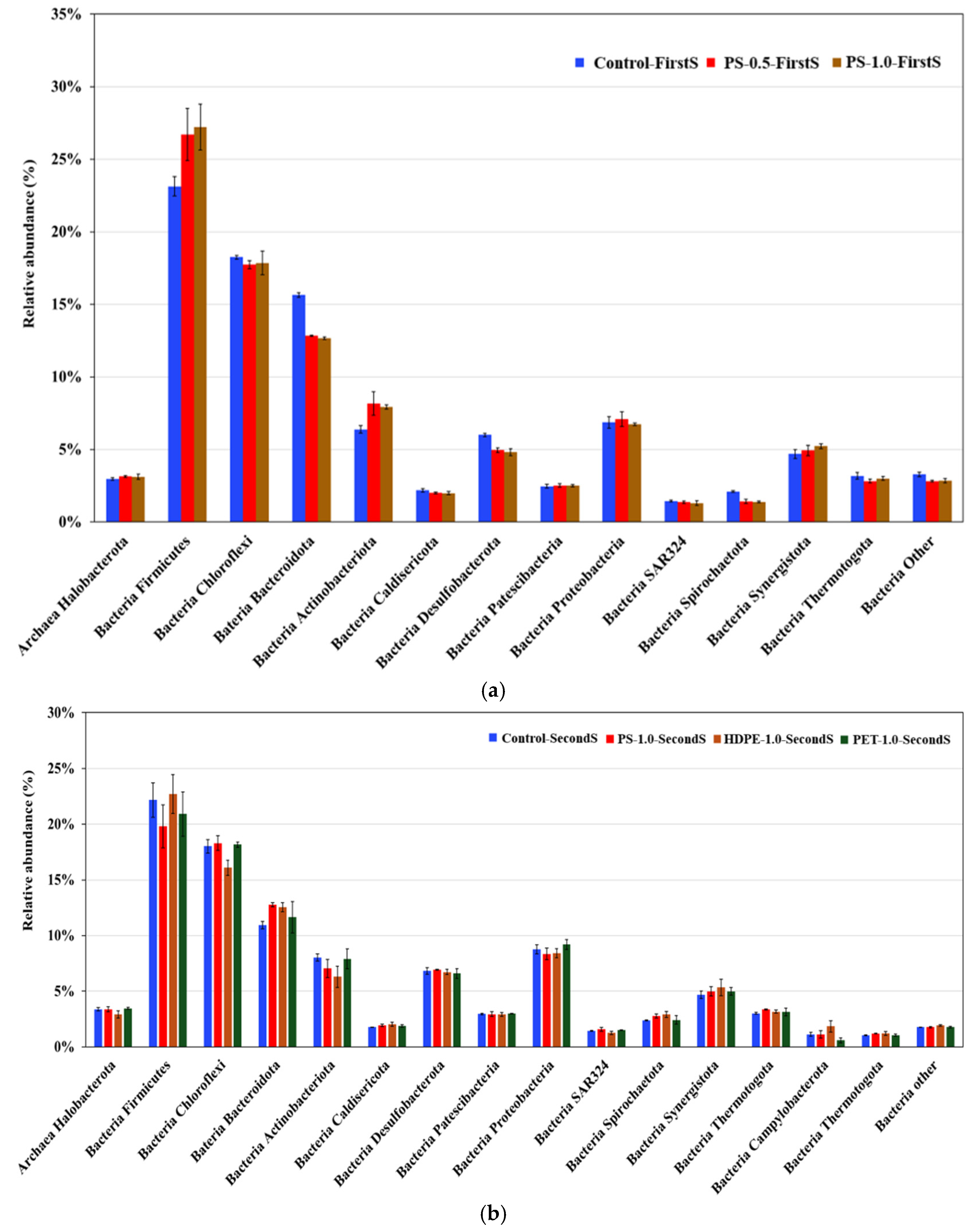 Firmicutes accounted for 23.14% (Control-FirstS), 26.71% (PS-0.5-FirstS), and 27.22% (PS-1.0-FirstS) of the total bacterial and archaeal populations. In the second series, their relative abundance was 22.2% (Control- SecondS), 19.82% (PS-1.0-SecondS), 22.71% (HDPE-1.0-SecondS), and 20.91% (PET-1.0-SecondS). The phylum