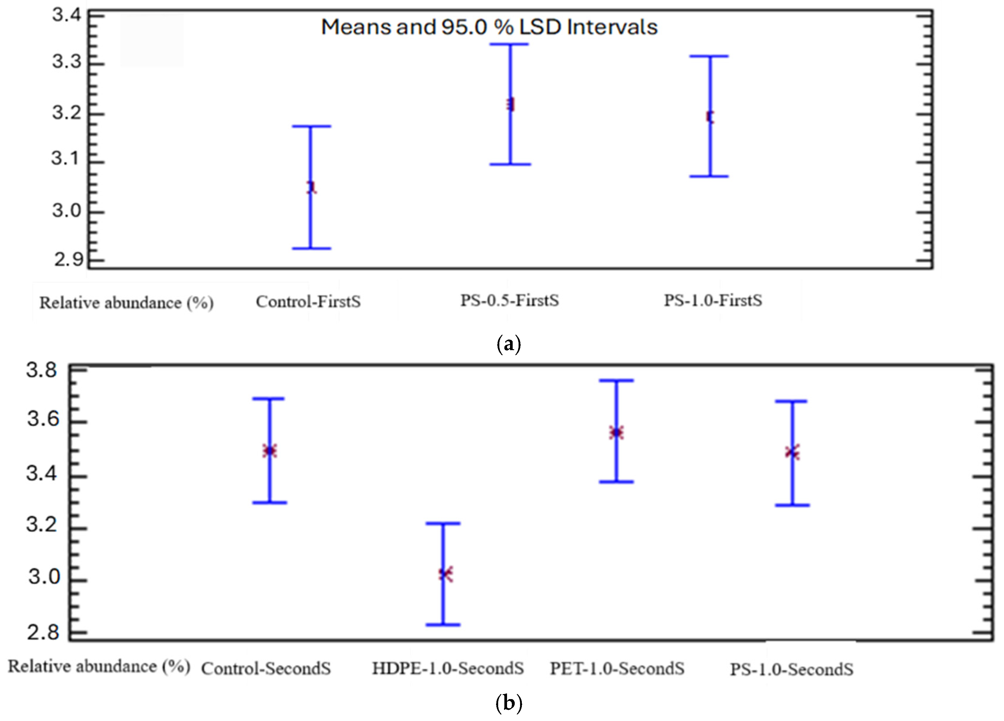 The F ratio in the first experimental series was 0.27, and, in the second experimental series, it was 0.04. Since the p-value of the F test in experimental series two was less than 0.05, there was a statistically significant difference between the mean relative abundance from one sample level to another at the 95.0% confidence level. Fisher’s least significant difference (LSD) procedure showed that relative PE abundance was significantly lower than in the B control.
