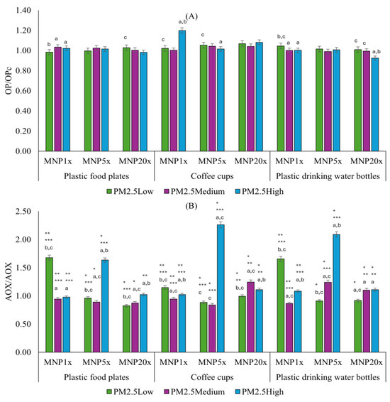 Oxidative indicators for the effect of MNP on PM2.5. (A) Oxidative potential (OP) changes by DTT assay in three concentrations of PM2.5 samples with various MNP exposures (OP: Oxidative potential in MNP-exposed PM2.5 (au), OPc: Oxidative potential index in control PM2.5 (au)), (B) Antioxidant activity changes by CUPRAC method in three concentrations of PM2.5 samples with various MNP exposures (AOX: Antioxidant activity in MNP-exposed PM2.5 (au), AOXc: Antioxidant activity in control PM2.5 (au)). The letters and signs above the bars indicated the statistical difference (p ˂ 0.05): (a) difference with MNP treatments for PM2.5 Low, (b) difference with MNP treatments for PM2.5 Medium, (c) difference with MNP treatments for PM2.5 High, (*) difference with MNP1×, (**) difference with MNP5×, and (***) difference with MNP20×.