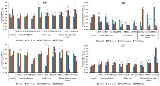 MNPs markedly alter the oxidative profile of their surrounding medium by releasing diverse leachates, such as low-molecular-weight oligomers, monomers, plasticizers, and surface-associated additives [69]. Many of these constituents contain redox-active functional groups capable of driving ROS generation through photosensitized pathways, electron-transfer reactions with dissolved organic matter, and catalytic redox cycling mediated by trace metal impurities [70,71]. Degradation-derived carbonyl- and aromatic-enriched fragments from polymers such as PET and PE further amplify superoxide and hydroxyl radical production, collectively elevating the oxidative potential of the medium [72]. These MNP-derived leachates and degradation fragments translate directly into measurable oxidative effects: in the DTT assay, their redox-active functional groups accelerate DTT consumption, indicating elevated oxidative potential [73,74,75]. At the same time, the increased generation of ROS and radical intermediates depletes or competes with endogenous antioxidant constituents, producing lower CUPRAC responses. Together, these shifts reflect a medium in which MNP-induced redox chemistry intensifies oxidative pressure while diminishing available antioxidant capacity. Evaluation of oxidative stress–related parameters revealed distinct, polymer- and dose-dependent effects of MNPs on PM2.5 redox behavior. DTT-based OP ratios showed that higher deviations from control values across all PM2.5 concentrations with plastic food plate-derived MNPs indicated minimal capacity to enhance or suppress electron-transfer activity. In contrast, more pronounced responses of coffee cup MNPs at low and medium PM2.5 levels suggested enhanced redox cycling likely driven by coating- or filler-derived leachates. MNPs from drinking water bottles displayed a biphasic pattern—low-dose treatments (1×) led to mild elevations in OP, whereas higher doses (especially at PM2.5-High) consistently reduced DTT consumption, indicating a quenching or adsorption-driven attenuation of PM-bound redox-active species [76,77,78].