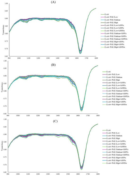 Metabolomic analysis of E. coli with and without MNP-exposed PM2.5 using FTIR spectroscopy. (A) FTIR spectrum of E. coli with and without plastic food plates MNP-exposed PM2.5, (B) FTIR spectrum of E. coli with and without coffee cups MNP-exposed PM2.5, (C) FTIR spectrum of E. coli with and without plastic drinking water bottles MNP-exposed PM2.5.