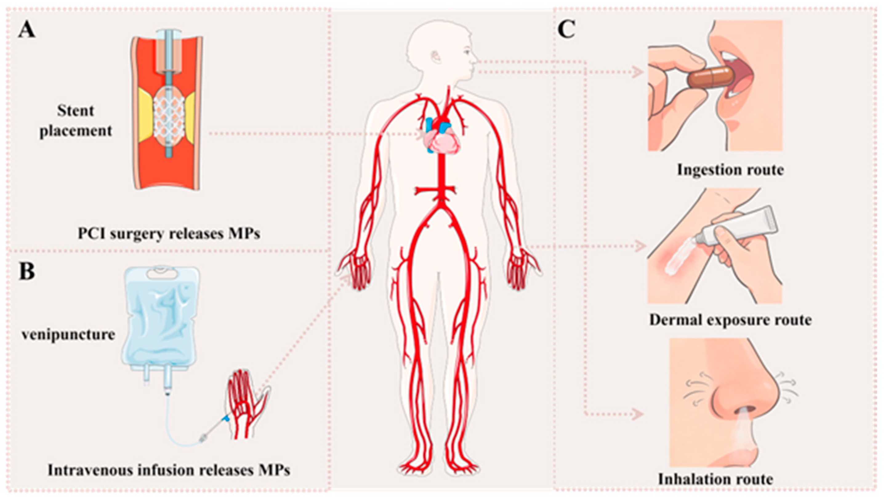 - Liu, S.; Yang, Y.; Du, Z.; Wang, C.; Li, L.; Zhang, M.; Ni, S.; Yue, Z.; Yang, K.; Gao, H.; et al. Percutaneous coronary intervention leads to microplastics entering the blood: Interventional devices are a major source. J. Hazard. Mater. 2024, 476, 135054. [Google Scholar] [CrossRef]