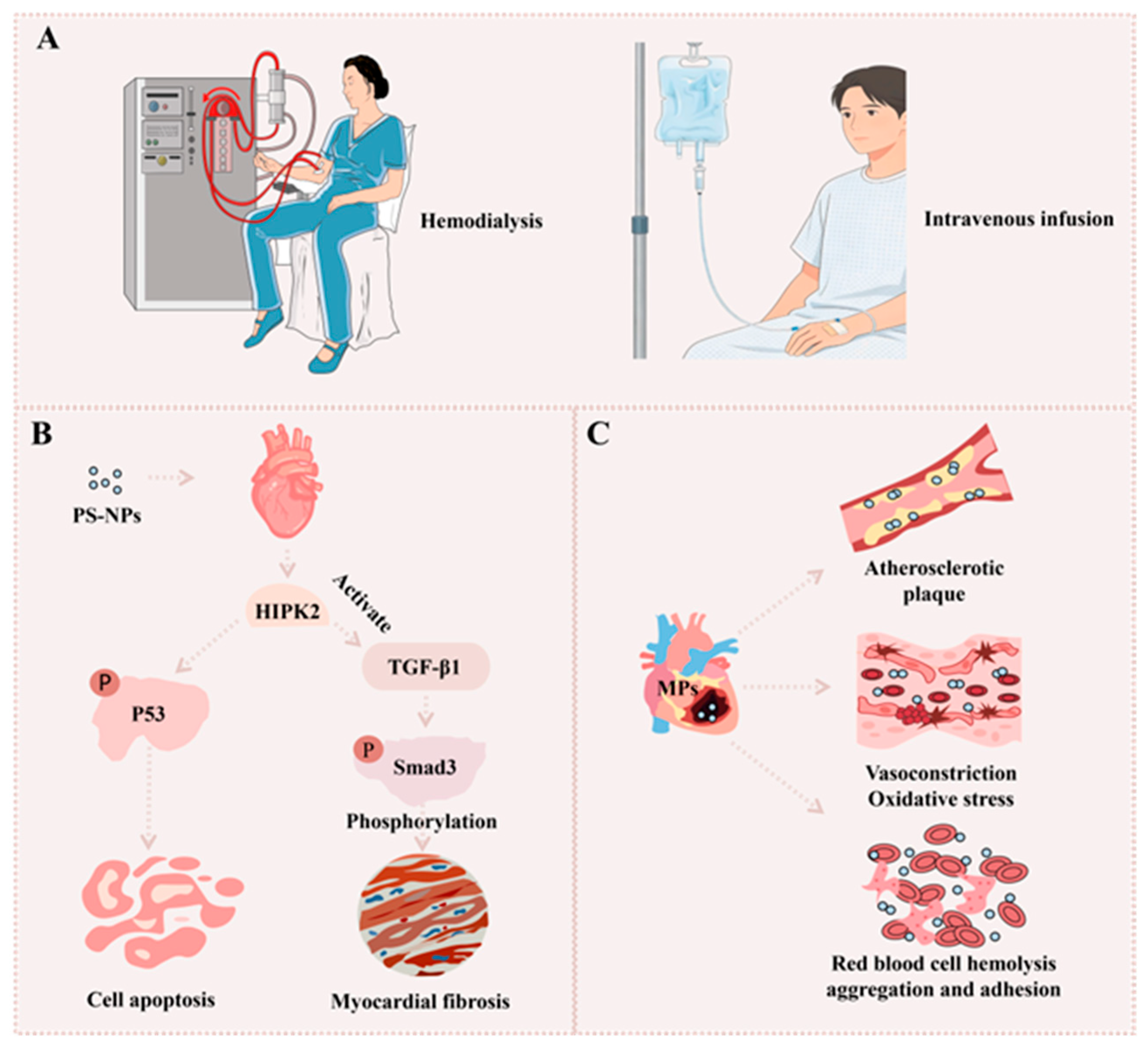 - Yang, J.Z.; Zhang, K.K.; Hsu, C.; Miao, L.; Chen, L.J.; Liu, J.L.; Li, J.H.; Li, X.W.; Zeng, J.H.; Chen, L.; et al. Polystyrene nanoplastics induce cardiotoxicity by upregulating HIPK2 and activating the P53 and TGF-beta1/Smad3 pathways. J. Hazard. Mater. 2024, 474, 134823. [Google Scholar] [CrossRef] [PubMed]