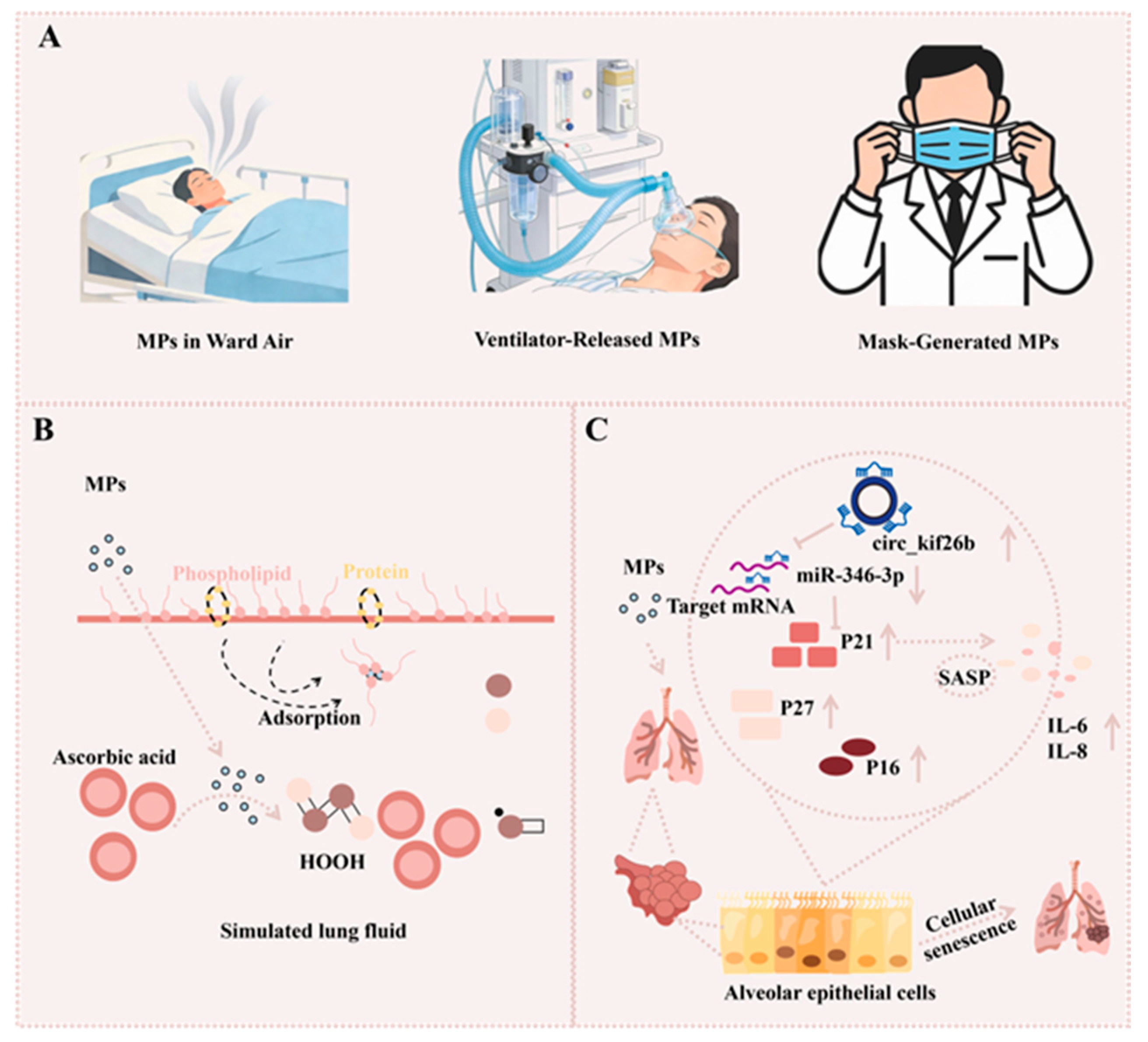 - Luo, H.; Xiao, T.; Sun, X.; Song, Y.; Shi, W.; Lu, K.; Chen, D.; Sun, C.; Bian, Q. The regulation of circRNA_kif26b on alveolar epithelial cell senescence via miR-346-3p is involved in microplastics-induced lung injuries. Sci. Total Environ. 2023, 882, 163512. [Google Scholar] [CrossRef] [PubMed]